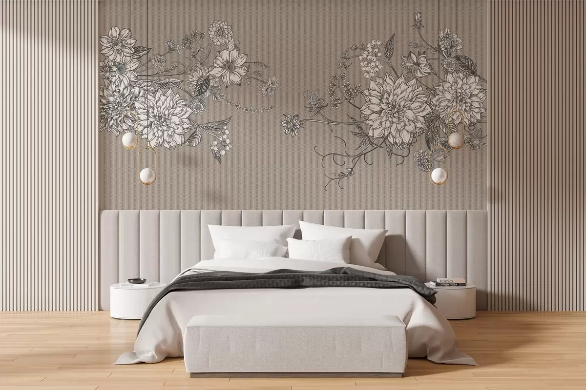 Fototapeten Grafische Blumen auf einem matten Hintergrund in Beigetönen N° w03395