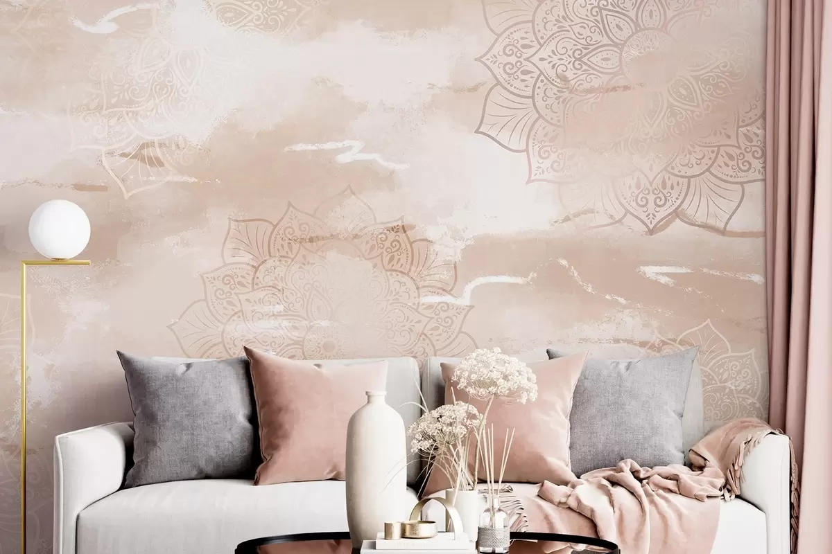 Fototapeten Mandalas auf dem pastellfarbenen Hintergrund, lebendige Pinselstriche, beige Farben N° w03409