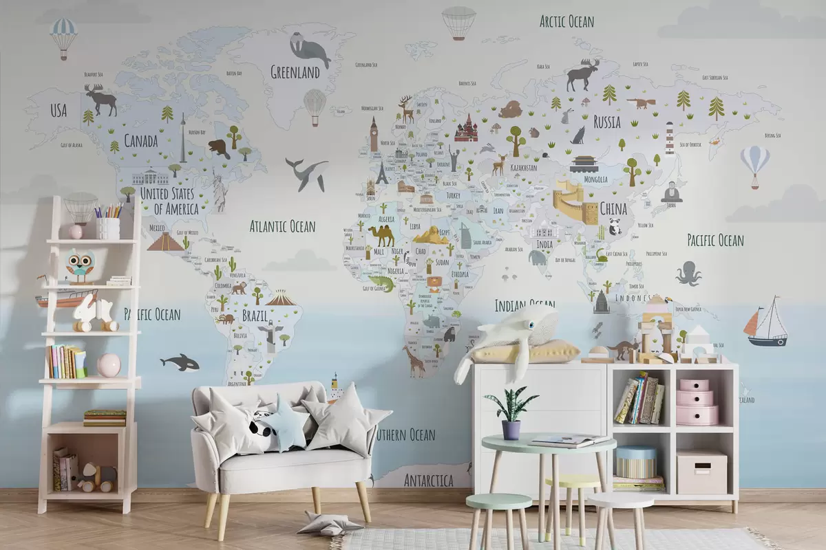 Fototapeten Weltkarte mit Tieren und Wahrzeichen N° w03410