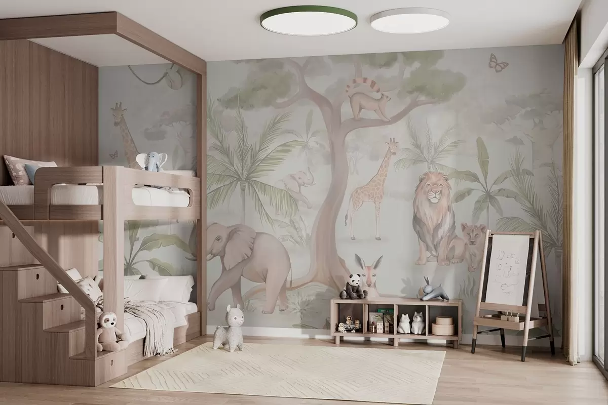 Fototapeten Panorama des Dschungels mit Tieren in hellen Farben N° w03444v1