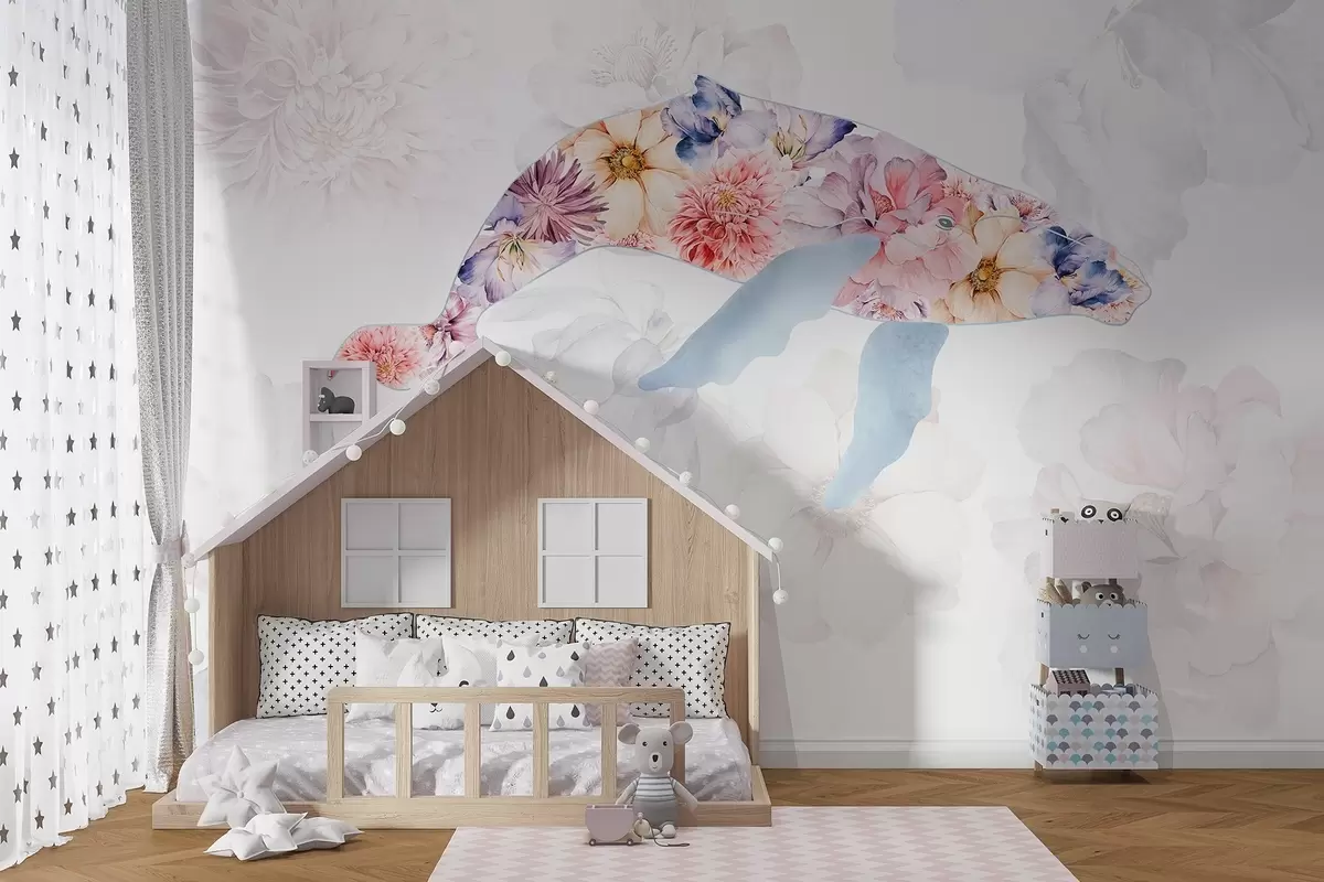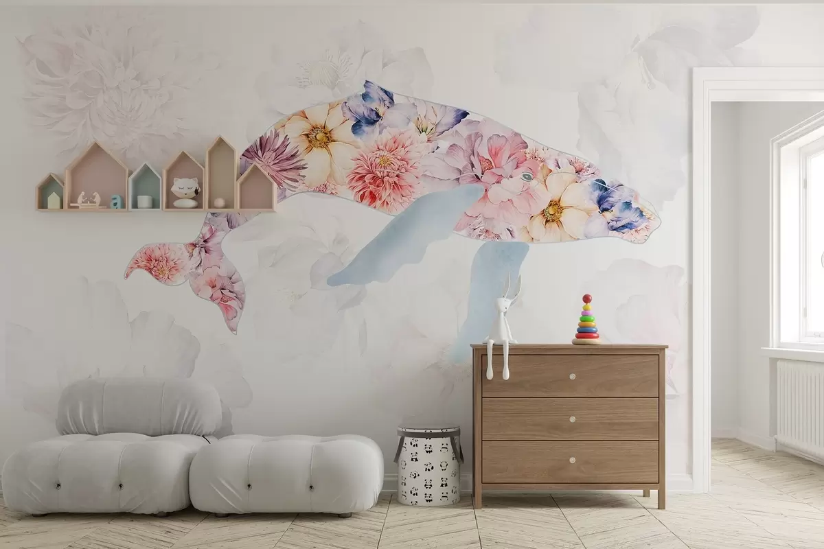 Fototapeten Wal mit Aquarell Blumen, Meerestiere, Minimalismus, bunt N° w03446