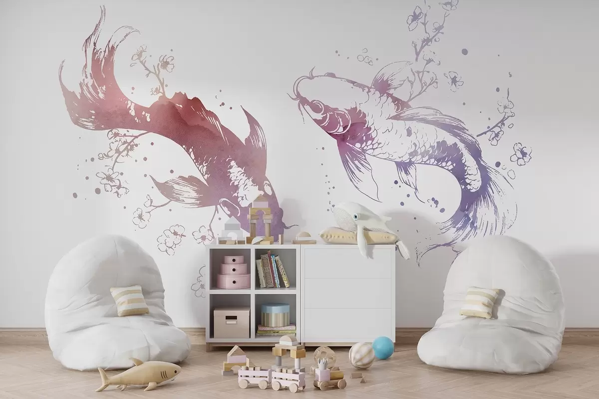 Fototapeten Aquarell Fisch, orientalischen Stil, Kirschbaum, lila Farben N° w03447v1