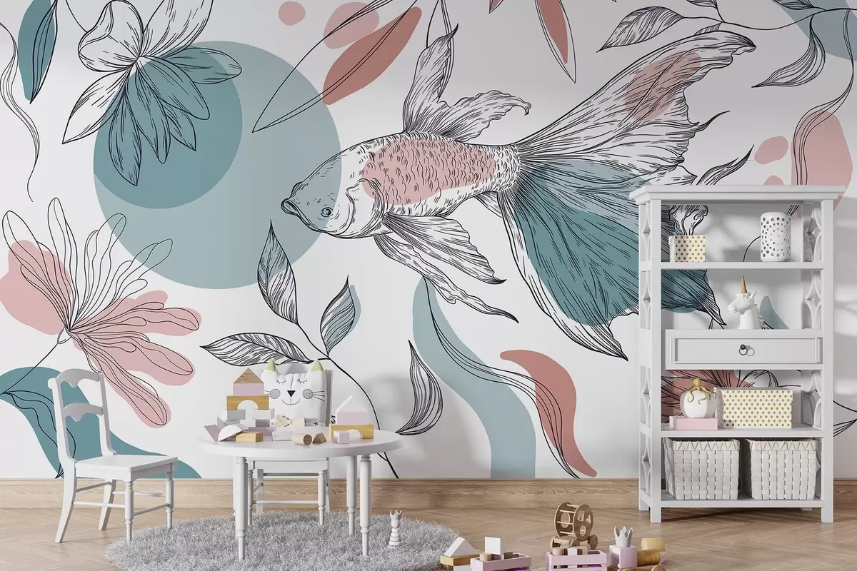 Fototapeten Strichzeichnung Fisch mit Blumen, Minimalismus, marine, floral, blau und rosa N° w03448v1