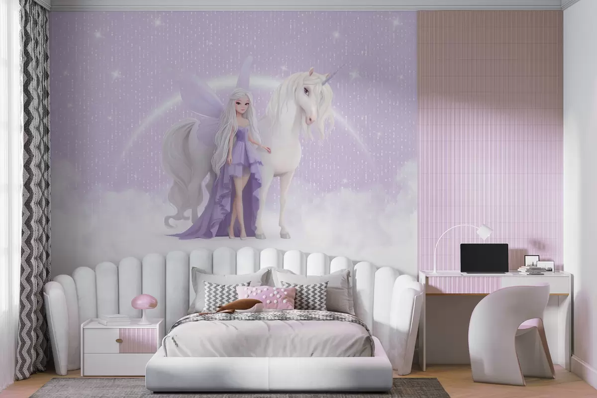 Fototapeten Eine Fee mit einem Einhorn in den Wolken N° w03527
