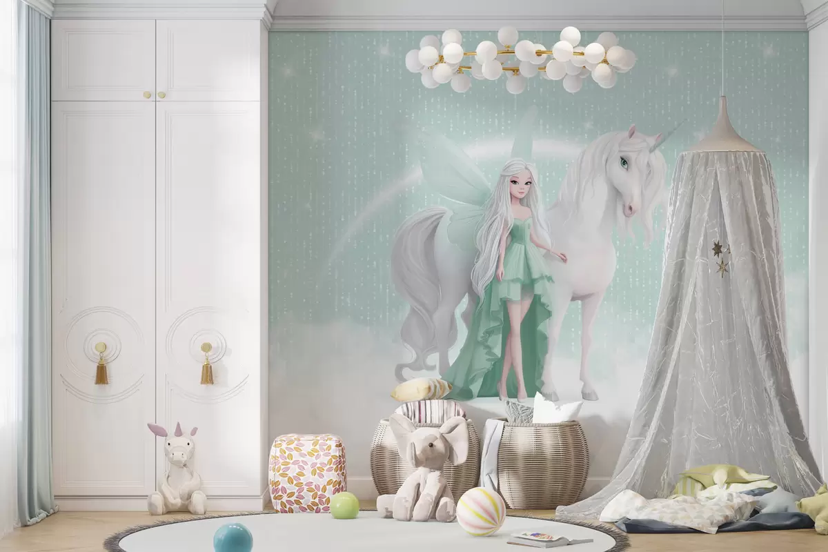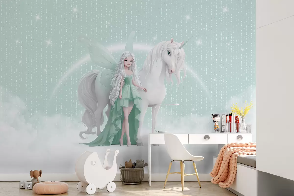 Fototapeten Eine Fee mit einem Einhorn in den Wolken N° w03527v2