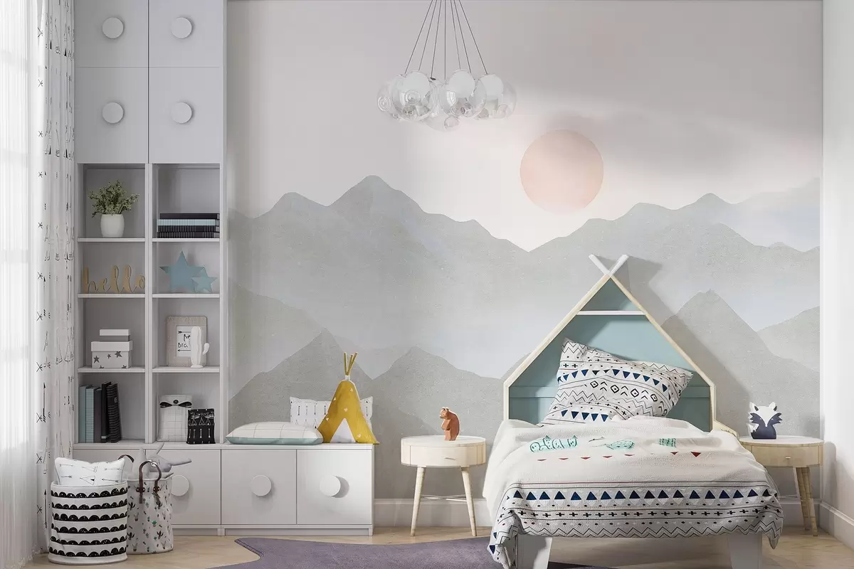 Fototapeten Boho-Stil Berge Landschaft, Sonnenuntergang, weichen Pastell, grau N° w03547v1