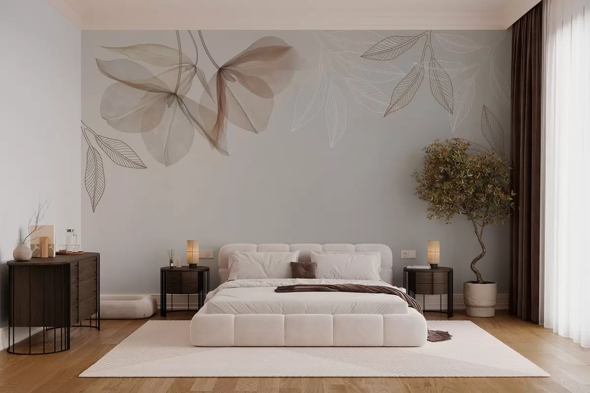 Fototapeten zarte durchscheinende Blüten und Blätter in Mokkatönen N° w03616v3