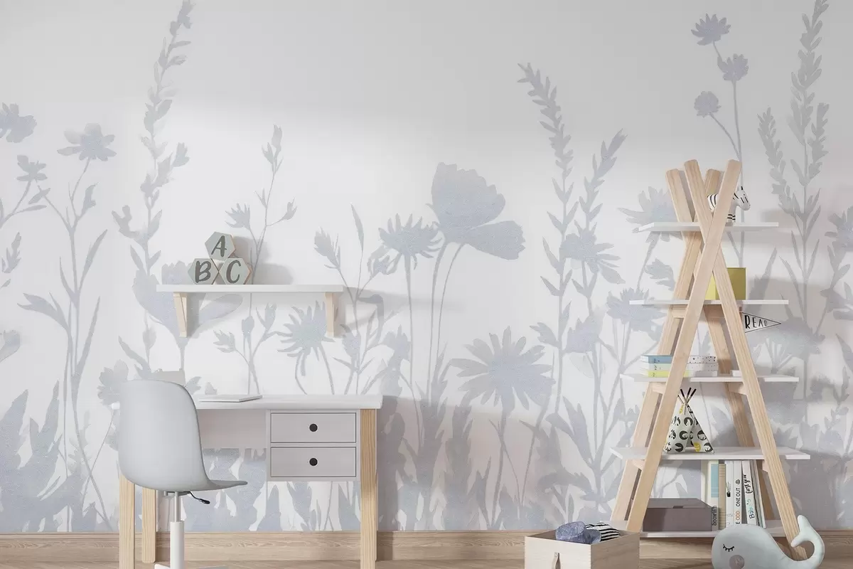 Fototapeten Sommerwiese, rustikal, Blumen, blaue Farbpalette N° w03670v1