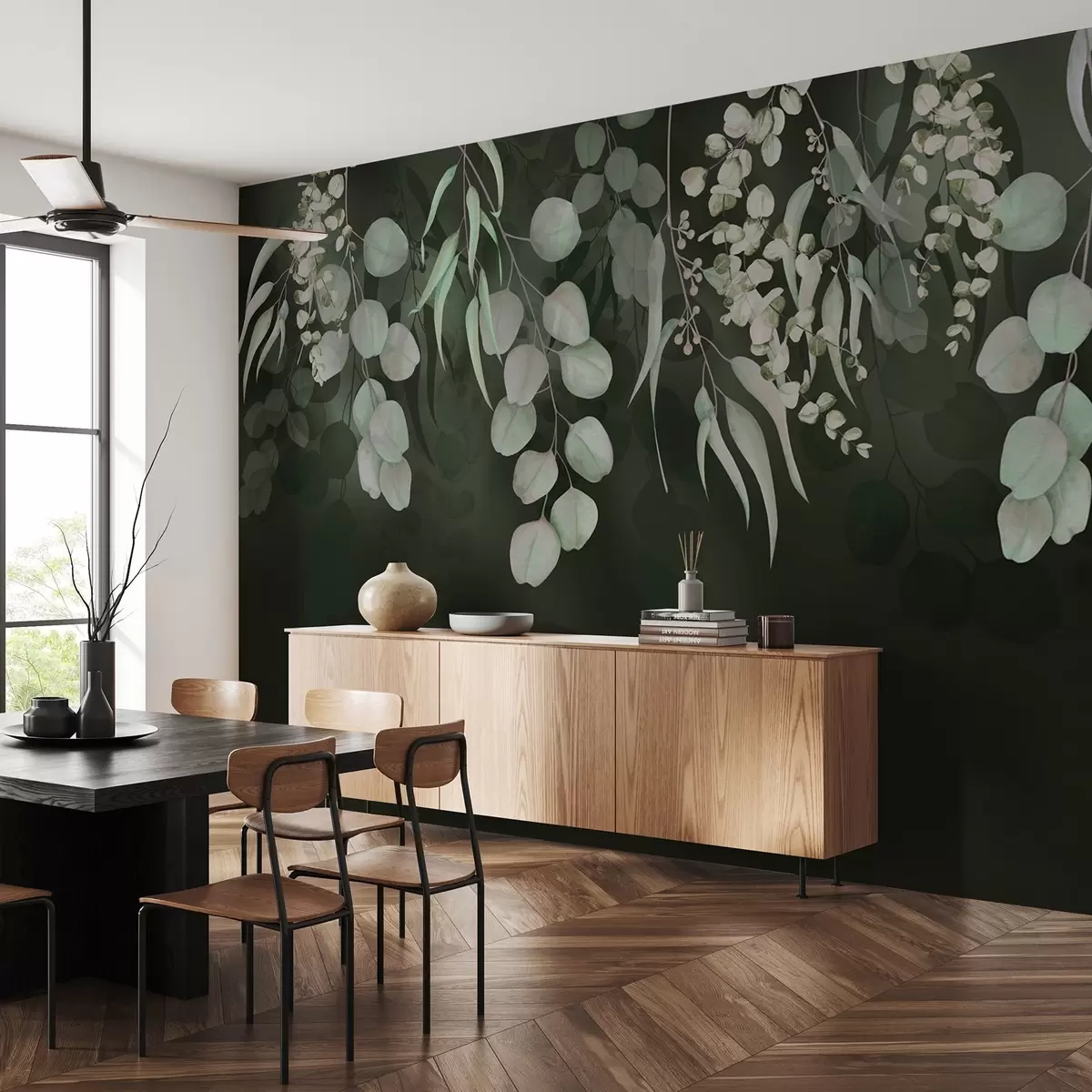 Fototapeten Tropische Blätter auf dunkelgrünem Hintergrund, blumig N° w03752