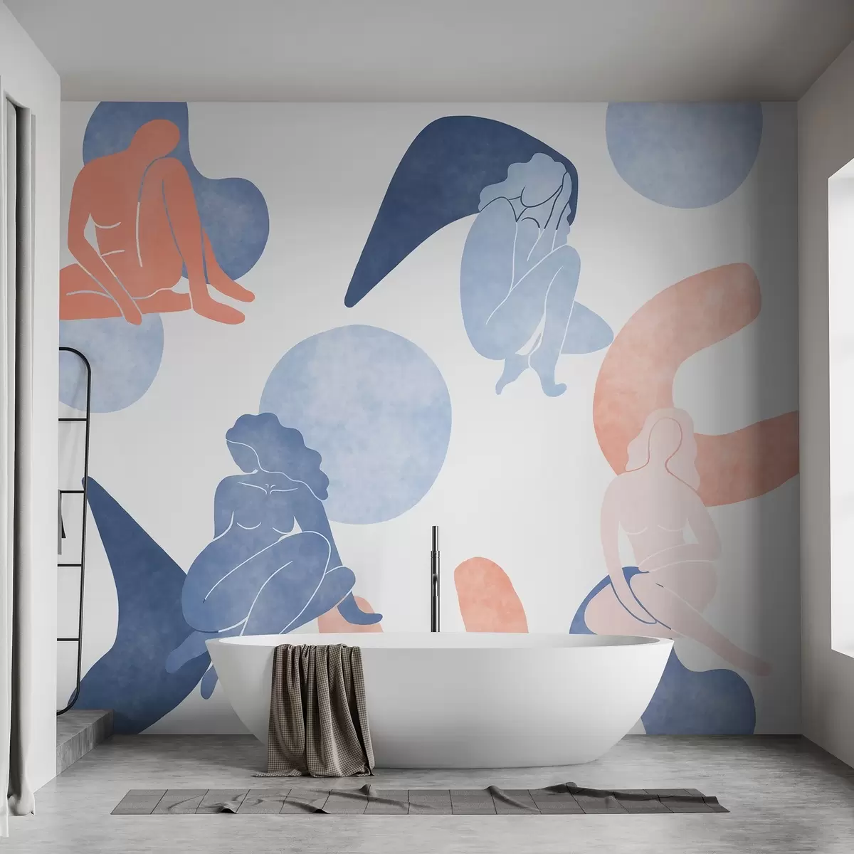Fototapeten Geometrische Abstraktionen mit weiblichen Silhouetten, Boho-Stil, blau, beige, rosa N° w03753v1