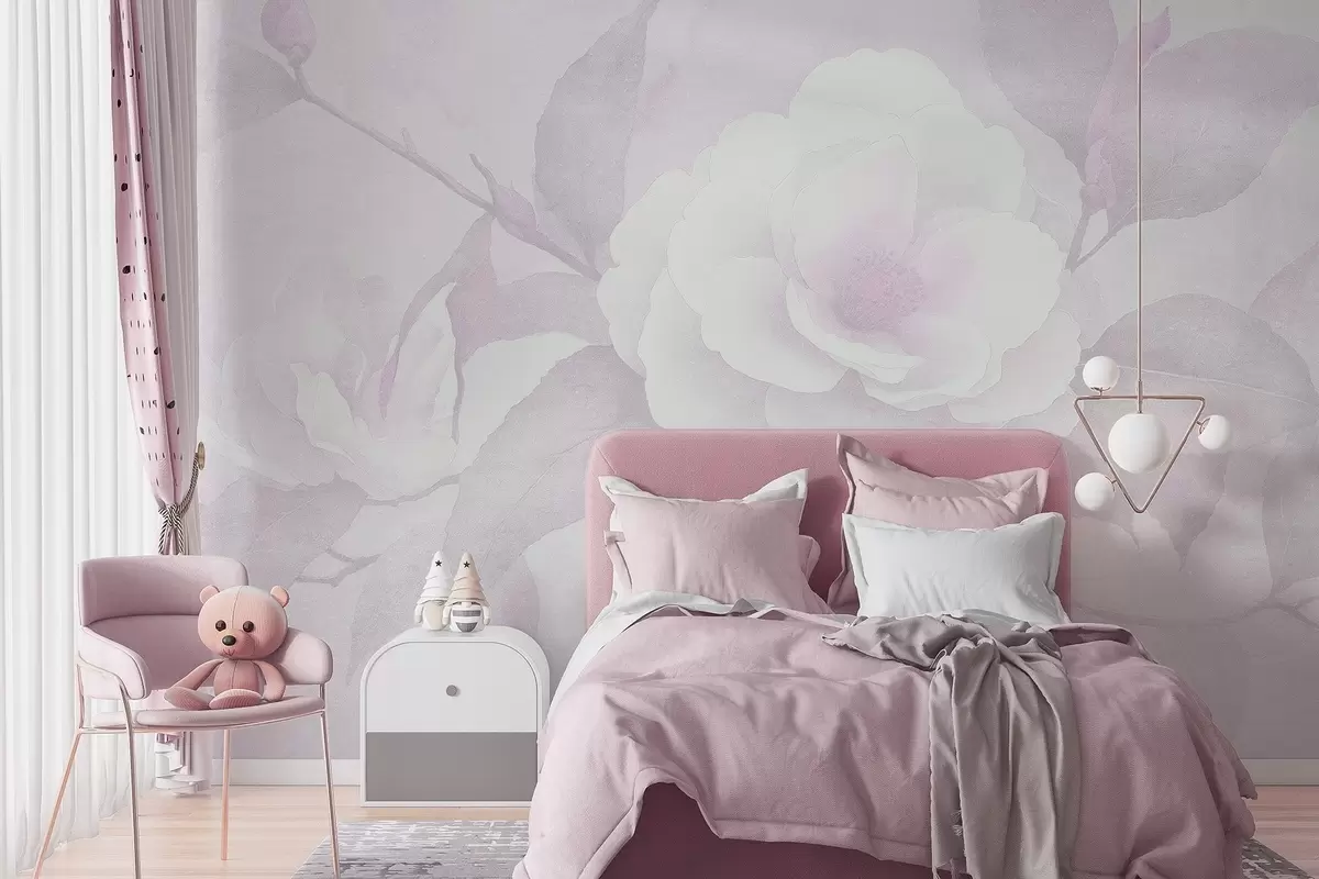 Fototapeten Sanftes Pastell mit Kamelienblüten auf dem Zweig, rosa Farben N° w03760v2