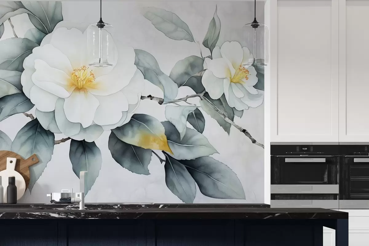 Fototapeten Aquarell Stil Kamelie Blumen auf dem Zweig, natürliche Farben N° w03761