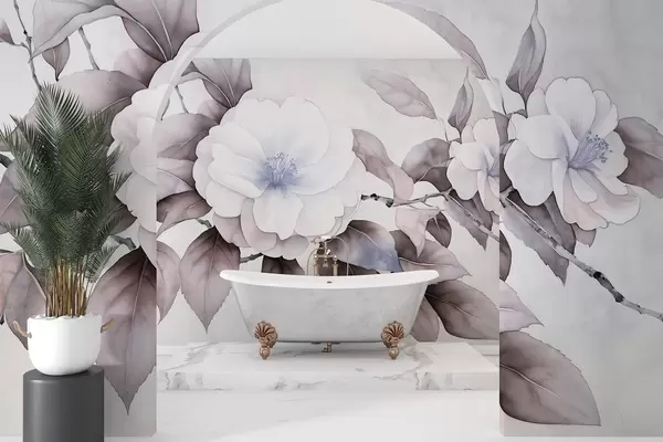 Fototapeten Aquarell-Stil Kamelie Blumen auf dem Zweig, lila Farben N° w03761v1