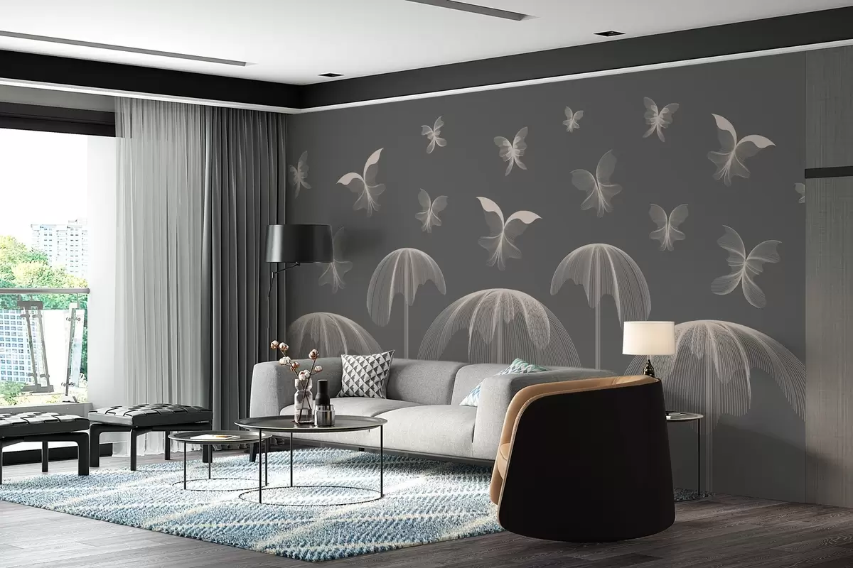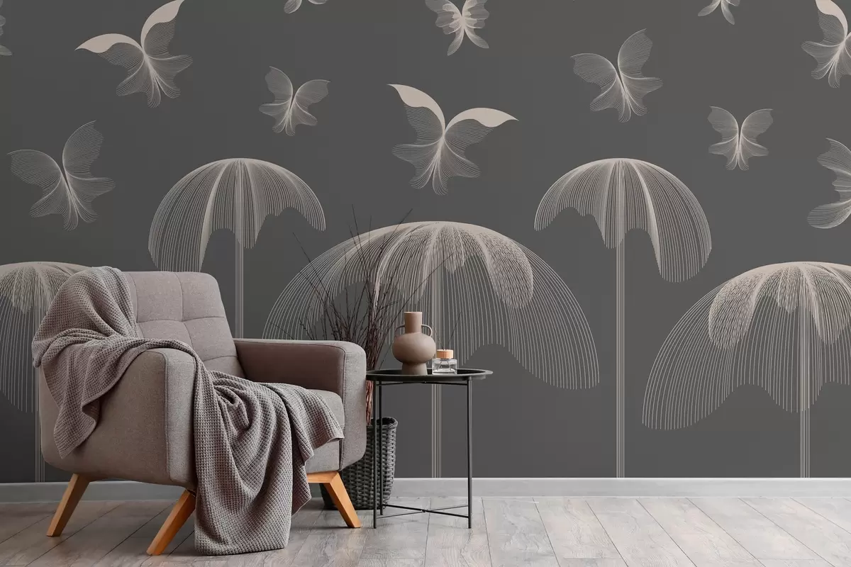 Fototapeten minimalistische lineare Tapete Schmetterlinge und Brunnen auf einem dunkelgrauen Hintergrund N° w03762v1
