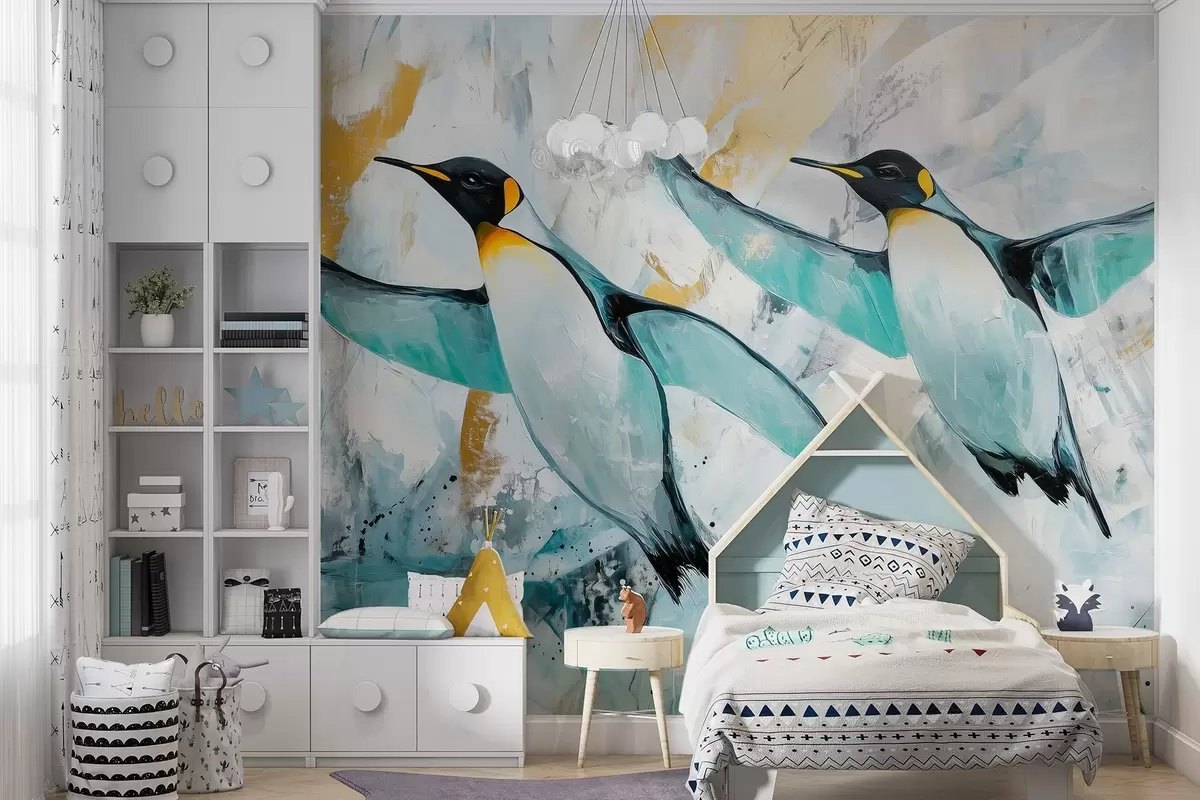 Fototapeten Niedliche Pinguine, Antarktis, blaues Eis, Tiere, Öl-Stilzeichnung N° w03883