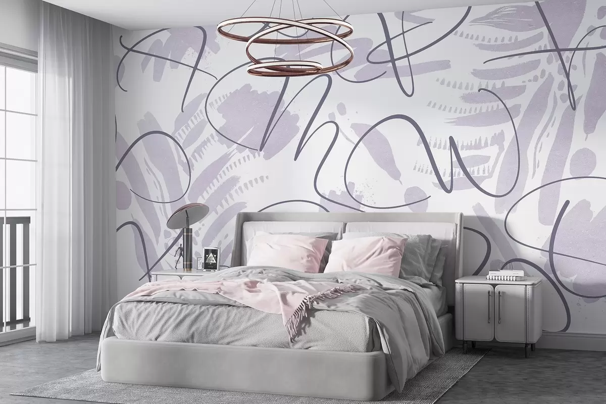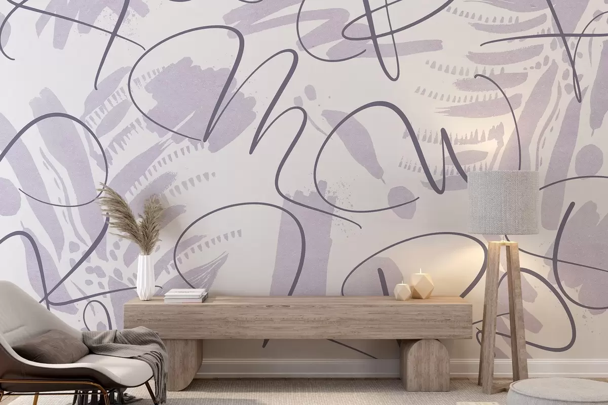 Fototapeten Kalligrafische Abstraktion mit Buchstaben, Pinselstrichen, lila Farbe N° w03913v2