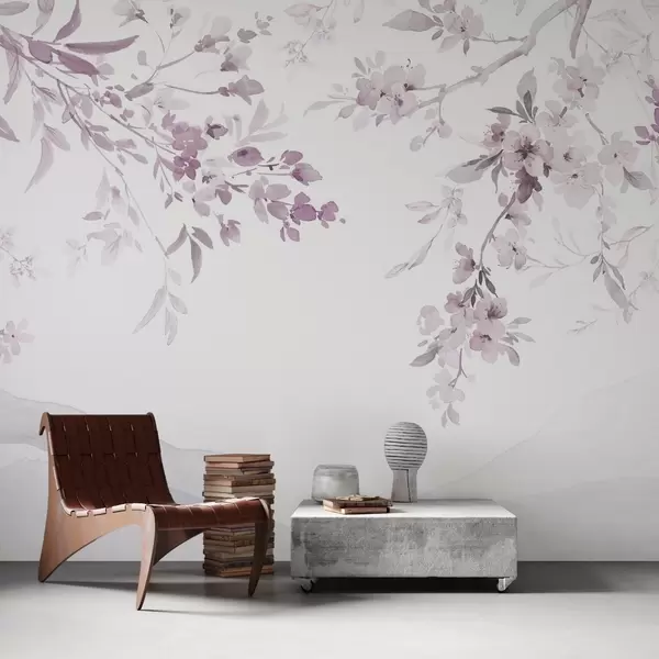 Fototapeten Blühende Zweige, Nachahmung eines Aquarells, lila-rosa Farbtöne N° w03935v1