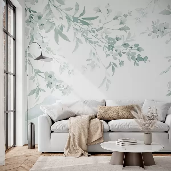 Fototapeten Blühende Zweige, Nachahmung eines Aquarells, Grüntöne N° w03935v3