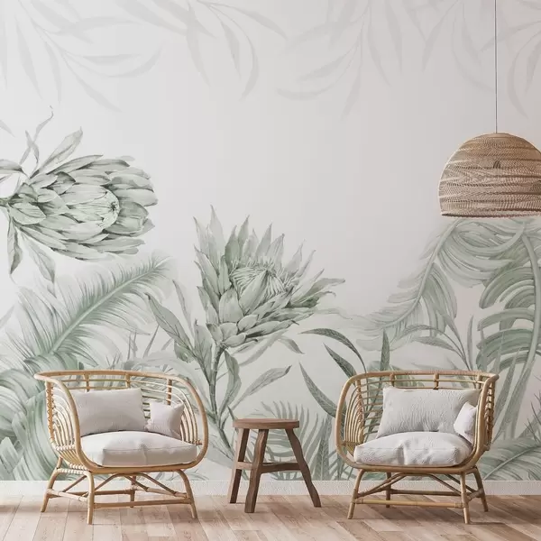 Fototapeten Protea unter tropischen Blättern, blaue Farbtöne N° w03952v3