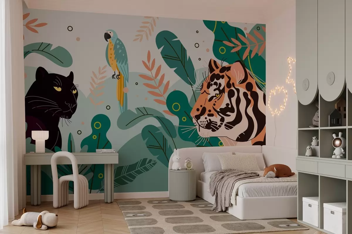 Fototapeten dschungel mit Tiger, Panther und Papagei N° w03958