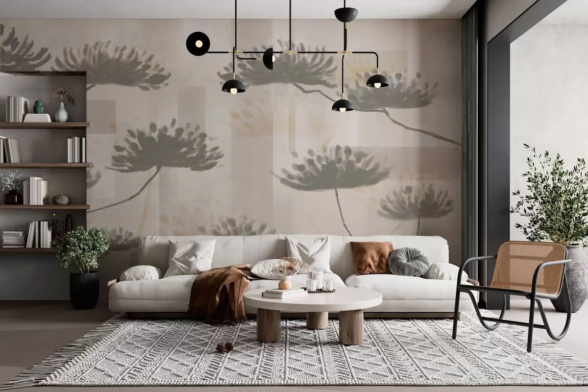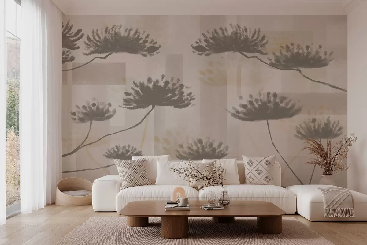 Fototapeten strukturierte Geometrie in Beige- und Cremetönen mit stilisierten Schirmblumen N° w03960