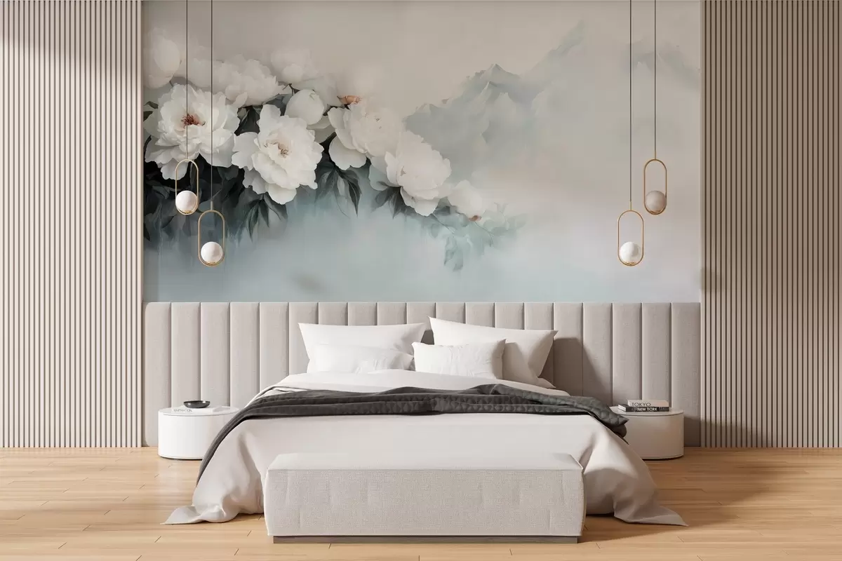 Fototapeten malerische üppige weiße Pfingstrosen vor der Kulisse nebliger Berge N° w03965