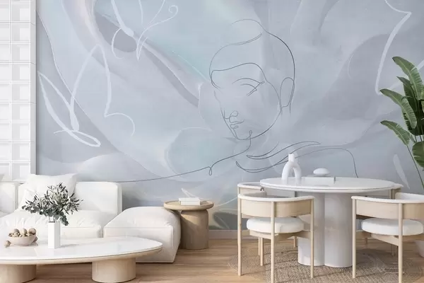 Fototapeten Florale Abstraktion mit Buddha-Linienzeichnung, blaue Farben N° w04004v1