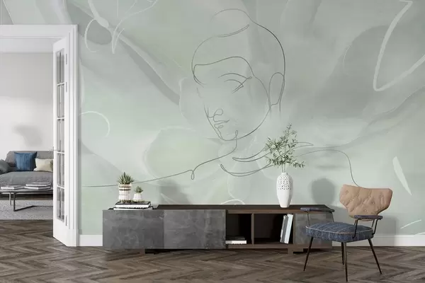 Fototapeten Florale Abstraktion mit Buddha-Linienzeichnung, grüne Farben N° w04004v3