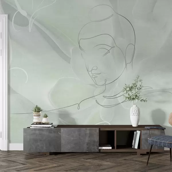 Fototapeten Florale Abstraktion mit Buddha-Linienzeichnung, grüne Farben N° w04004v3