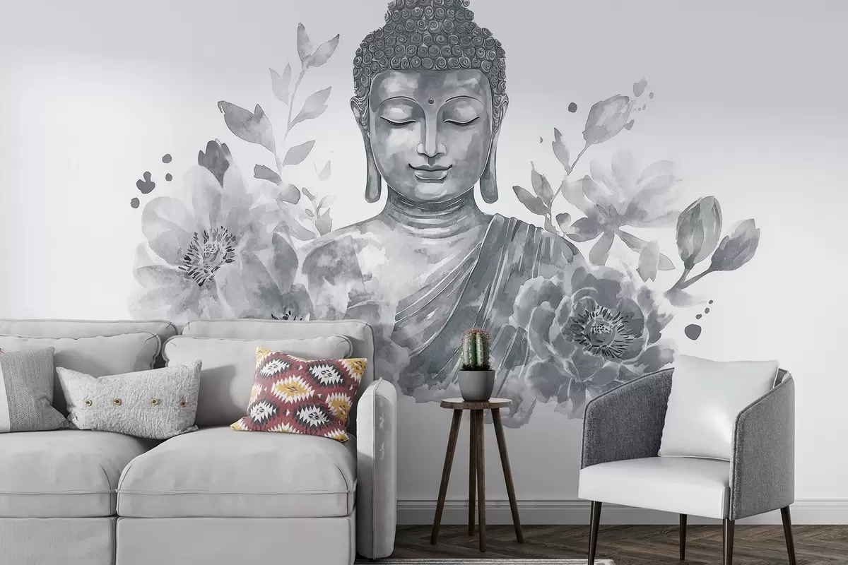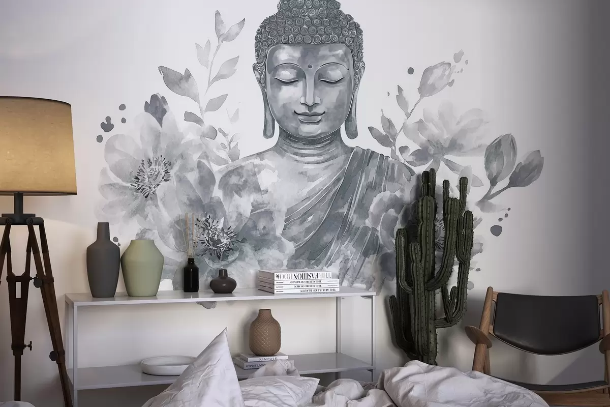 Fototapeten Aquarell-Buddha mit Blumen, spirituell, graue Farbpalette N° w04005v1
