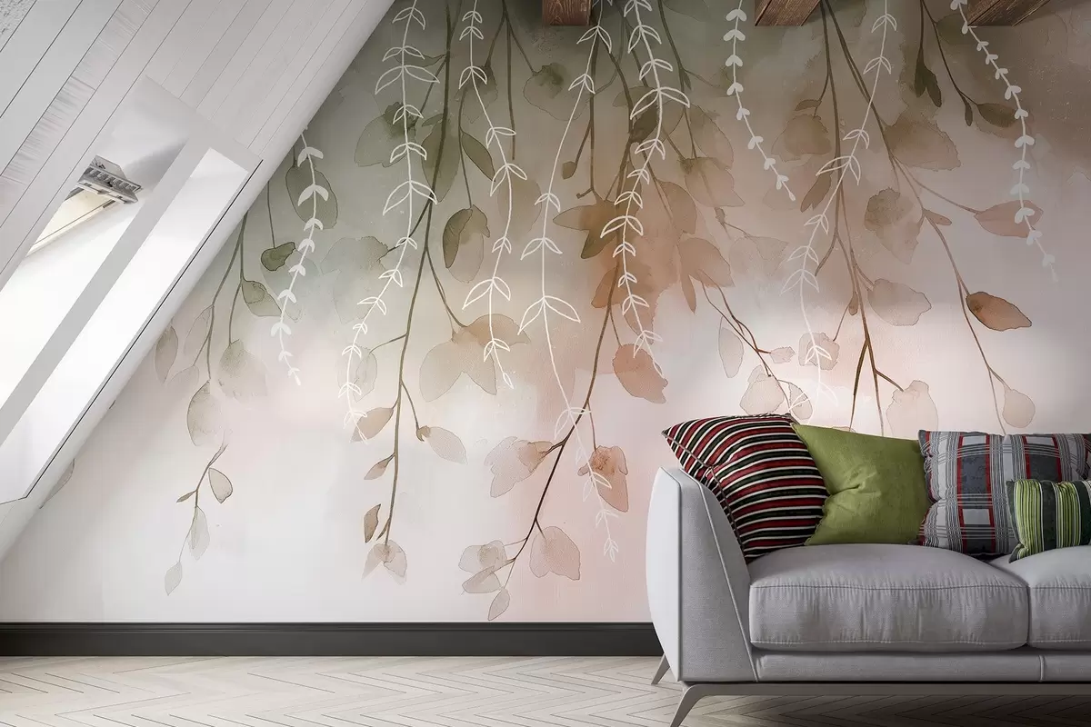 Fototapeten Äste mit Blättern im Aquarellstil, natürliche Herbstfarben N° w04007v1