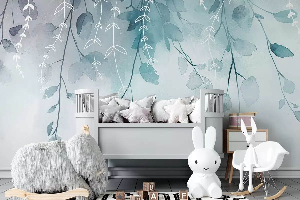 Fototapeten Äste mit Blättern im Aquarellstil, natürliche Aquamarinfarben N° w04007v3