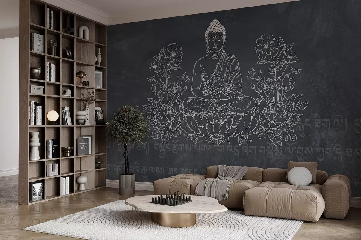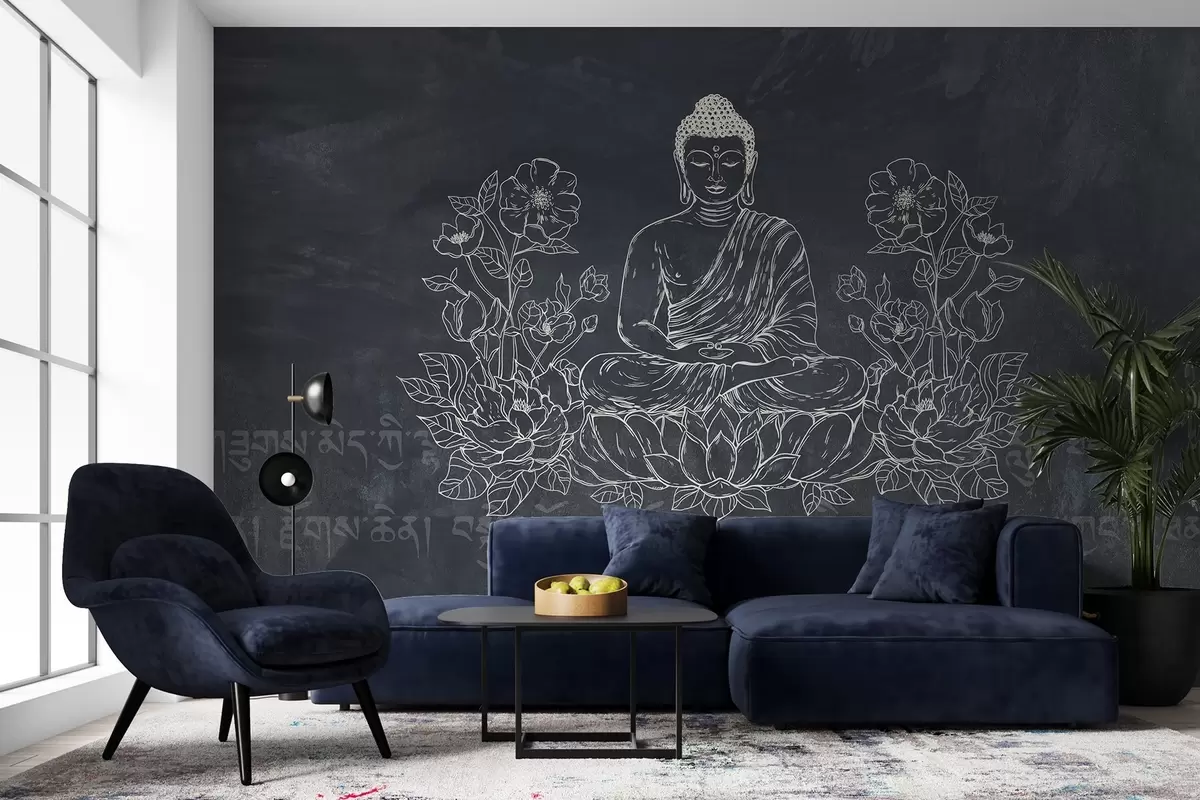 Fototapeten Meditierender Buddha mit Lotosblüten, Strichzeichnung, orientalisch, dunkler Hintergrund N° w04008
