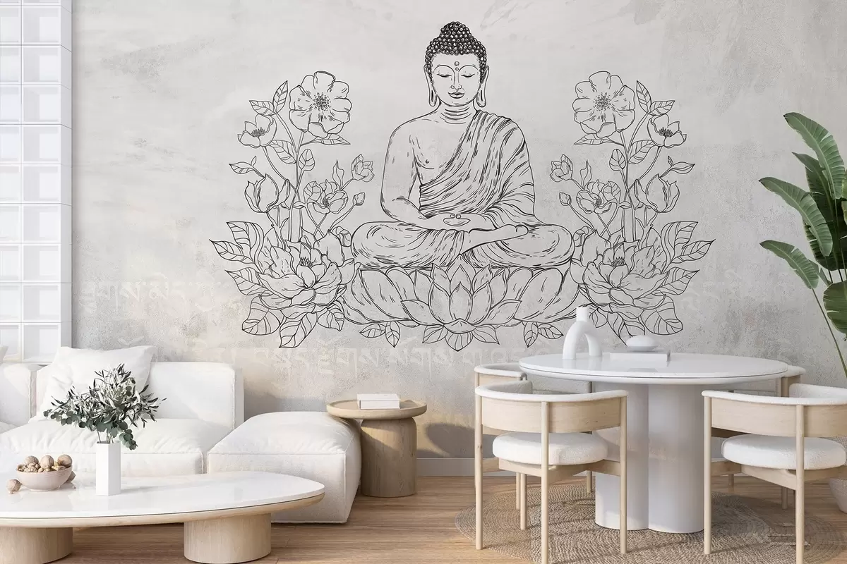Fototapeten Meditierender Buddha mit Lotusblumen, Strichzeichnung, orientalisch, beiger Hintergrund N° w04008v1