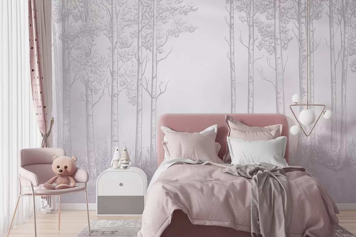 Fototapeten Wald mit Birken, Minimalismus, Natur, rosa Farbpalette N° w04009v2