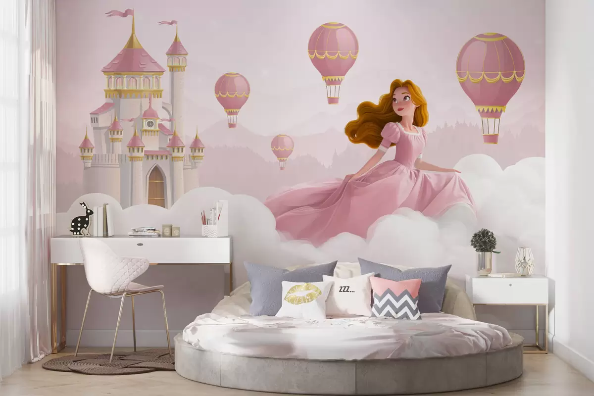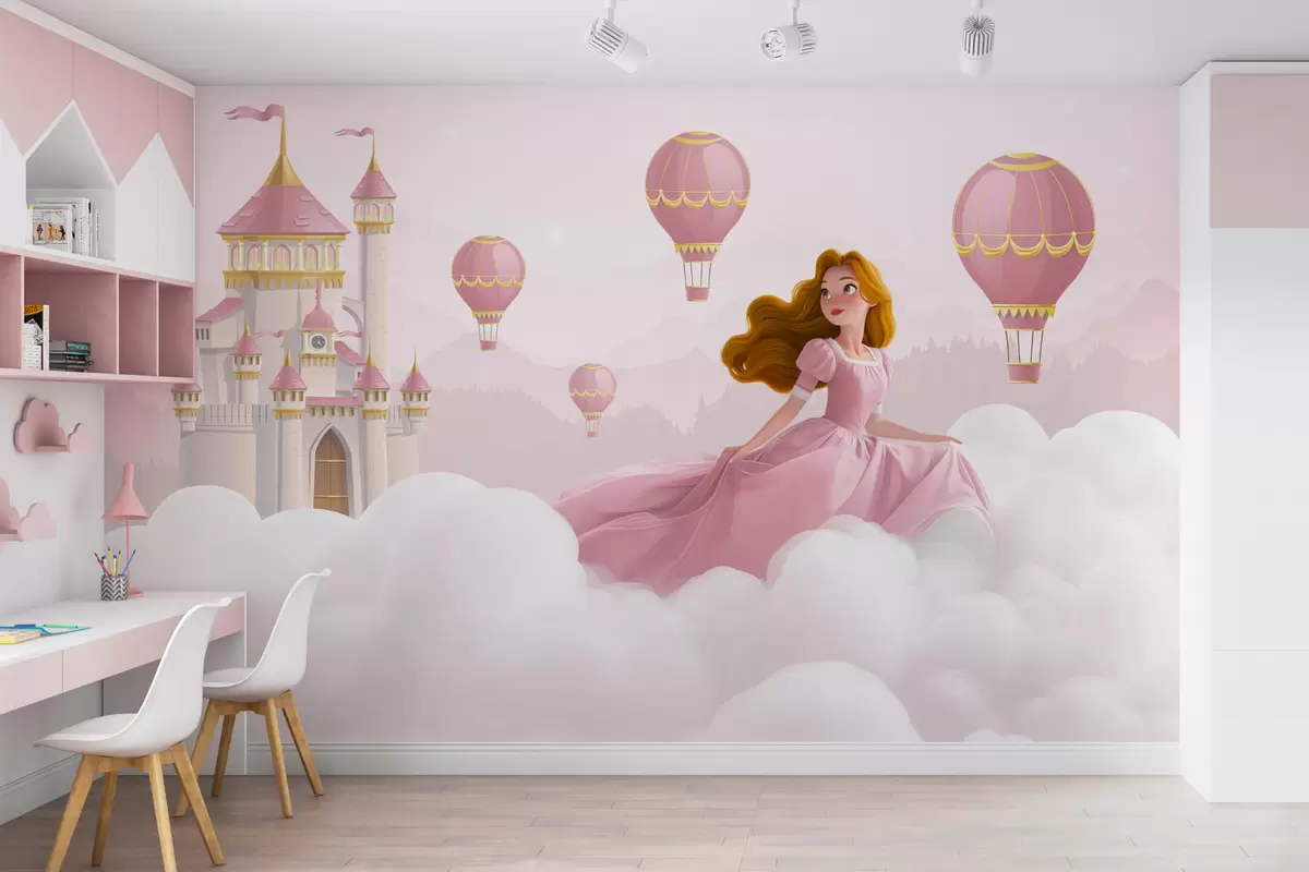 Fototapeten Prinzessin zwischen den Wolken auf dem Hintergrund der Landschaft mit dem Schloss N° w04015v1