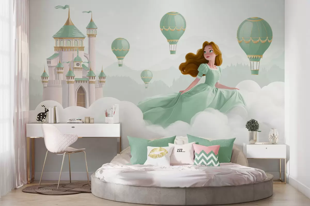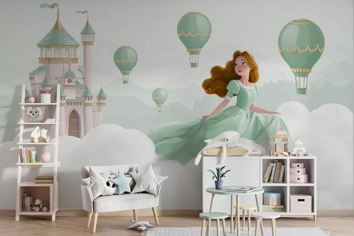 Fototapeten Prinzessin zwischen den Wolken auf dem Hintergrund der Landschaft mit dem Schloss N° w04015v2