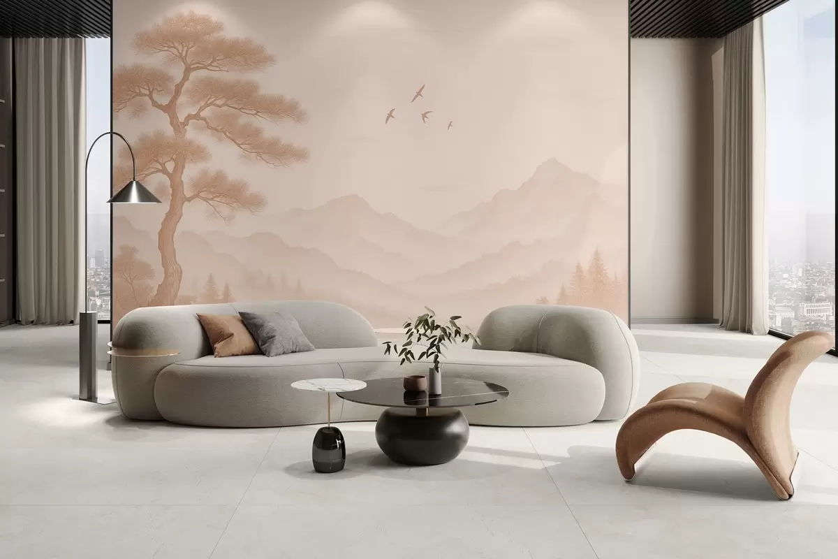 Fototapeten panorama von Hügeln mit einem großen Baum in Mokka-Tönen N° w04033v1