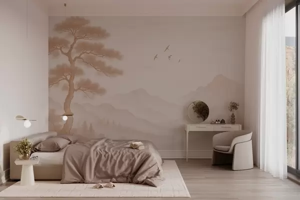 Fototapeten panorama von Hügeln mit einem großen Baum in Mokka-Tönen N° w04033v1
