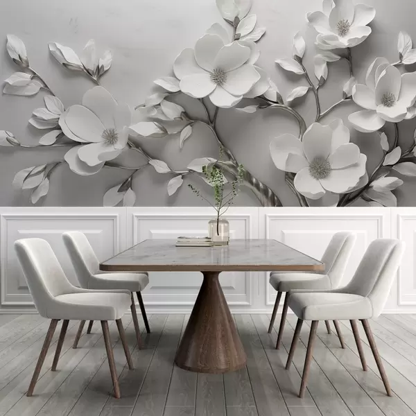 Fototapeten Dimensioneller Blumenzweig in reinem Weiß und neutralen Tönen N° w04039v2