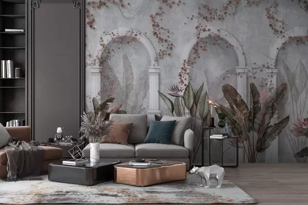 Fototapeten Betonmauer mit Bögen und tropischen Pflanzen, blumig, burgunderrote Farben N° w04065v1