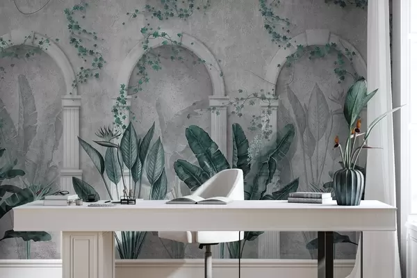 Fototapeten Betonwand mit Bögen und tropischen Pflanzen, floral, blaue Farben N° w04065v2