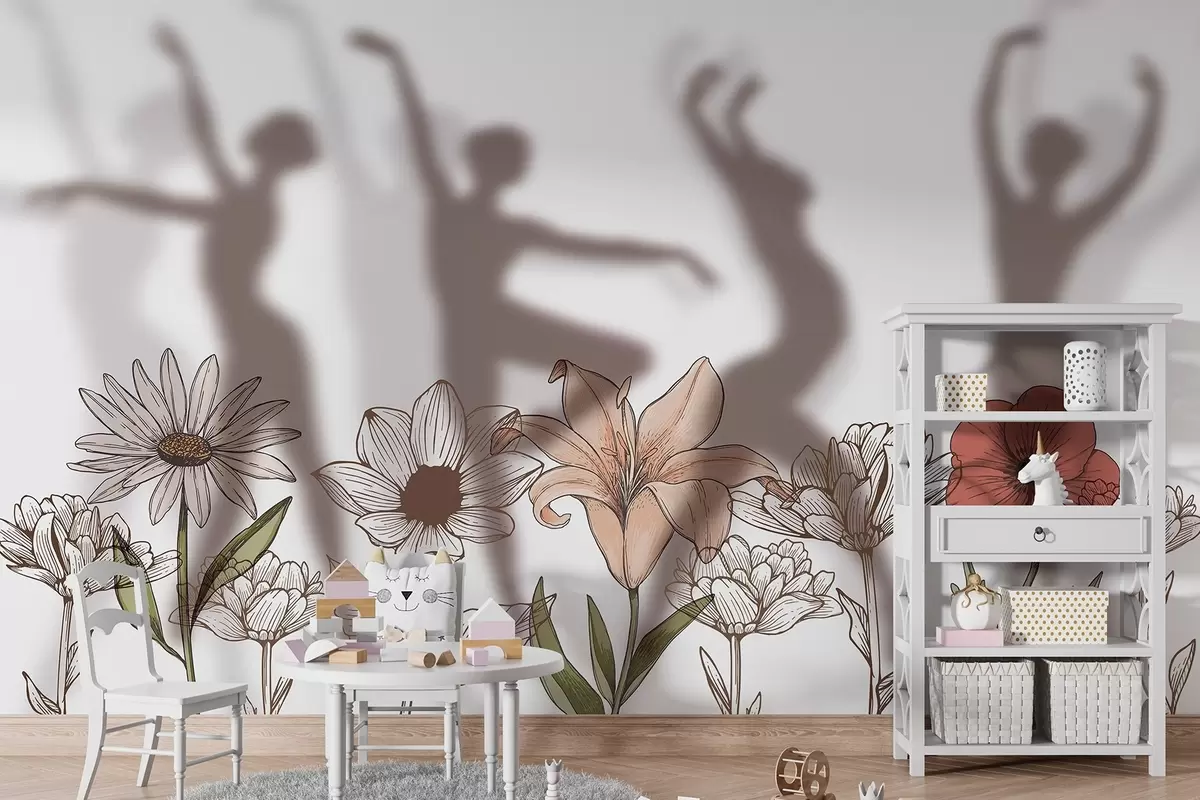 Fototapeten Ballerina-Silhouetten, rustikale Blumen, Linienkunst, rote und beige Farben N° w04069