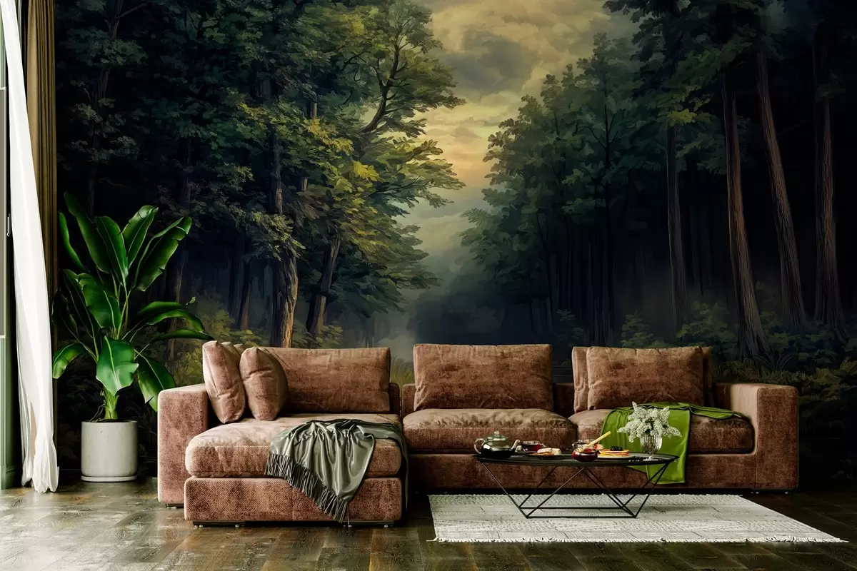 Fototapeten Wald mit Hirsch und Fluss im Stil der holländischen Ölmalerei N° w04072
