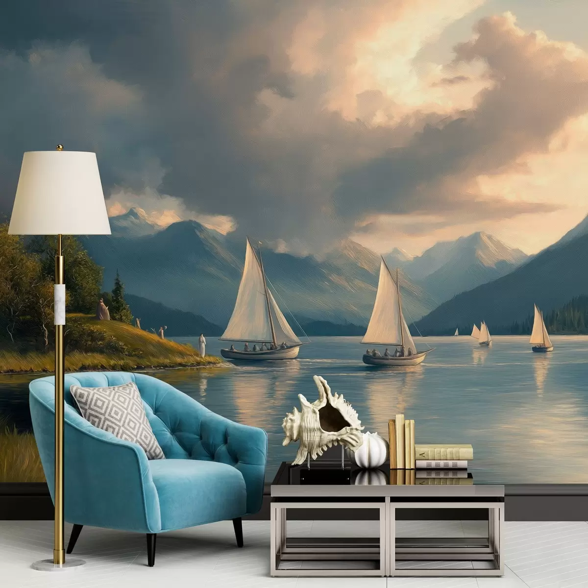 Fototapeten regatta auf einem See mit bewölktem Himmel im Stil eines Ölgemäldes aus dem 19 N° w04076