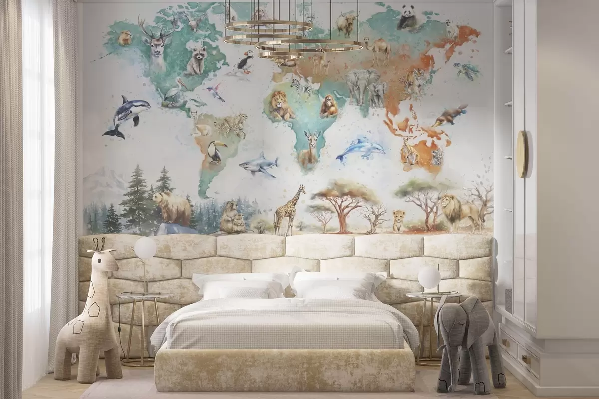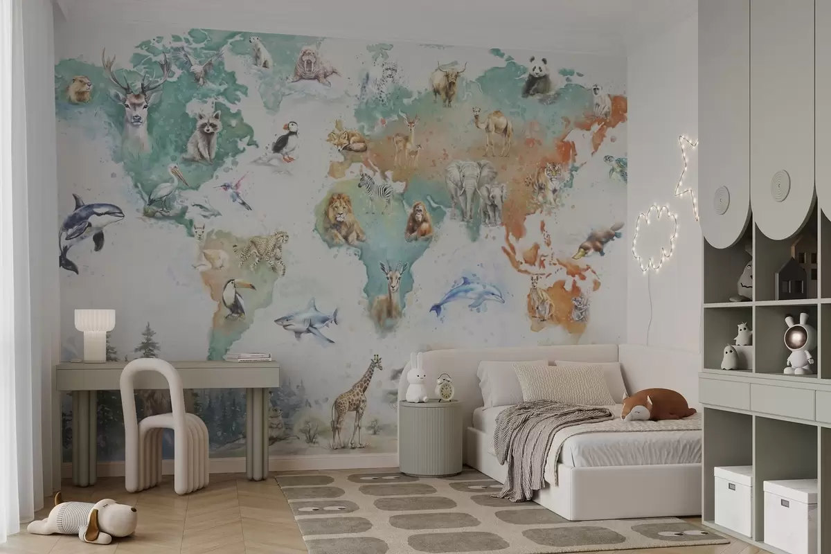 Fototapeten Weltkarte mit Tieren, pädagogischer Illustrationsstil für Kinder N° w04148