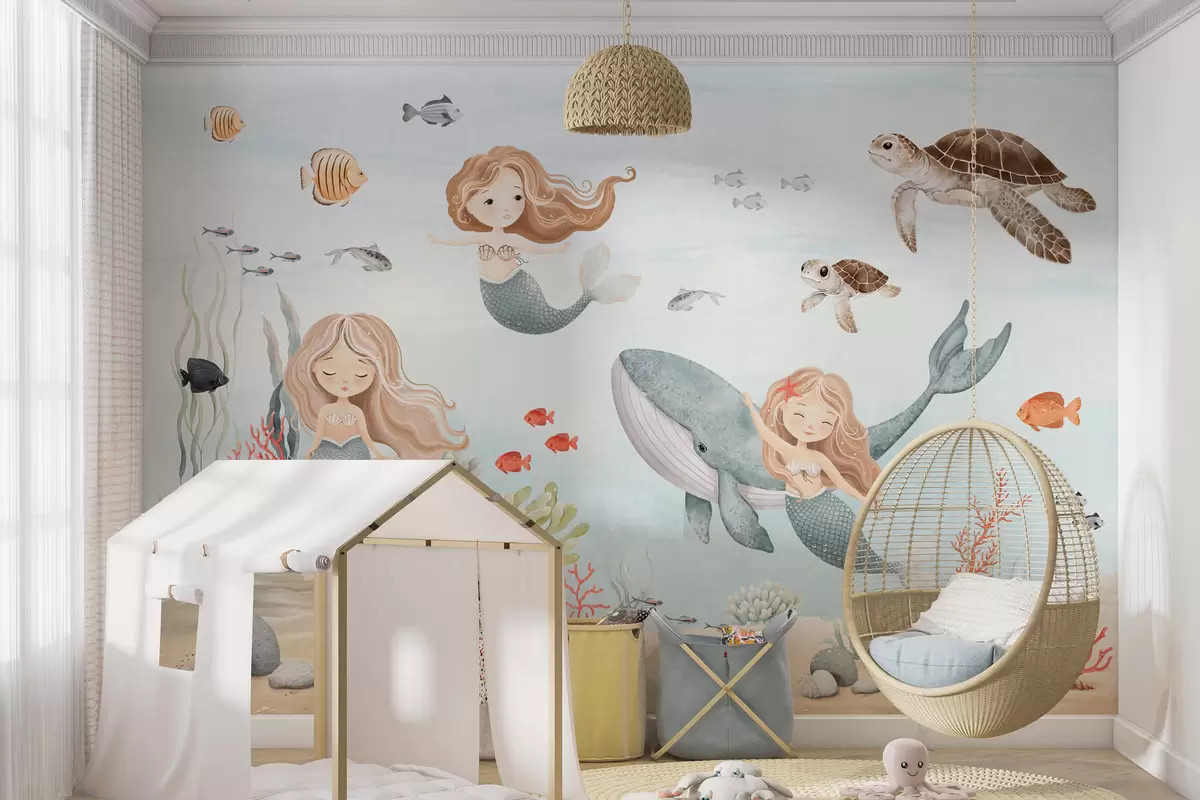 Fototapeten Unterwasserwelt mit Meerjungfrauen und Fischen N° w04166