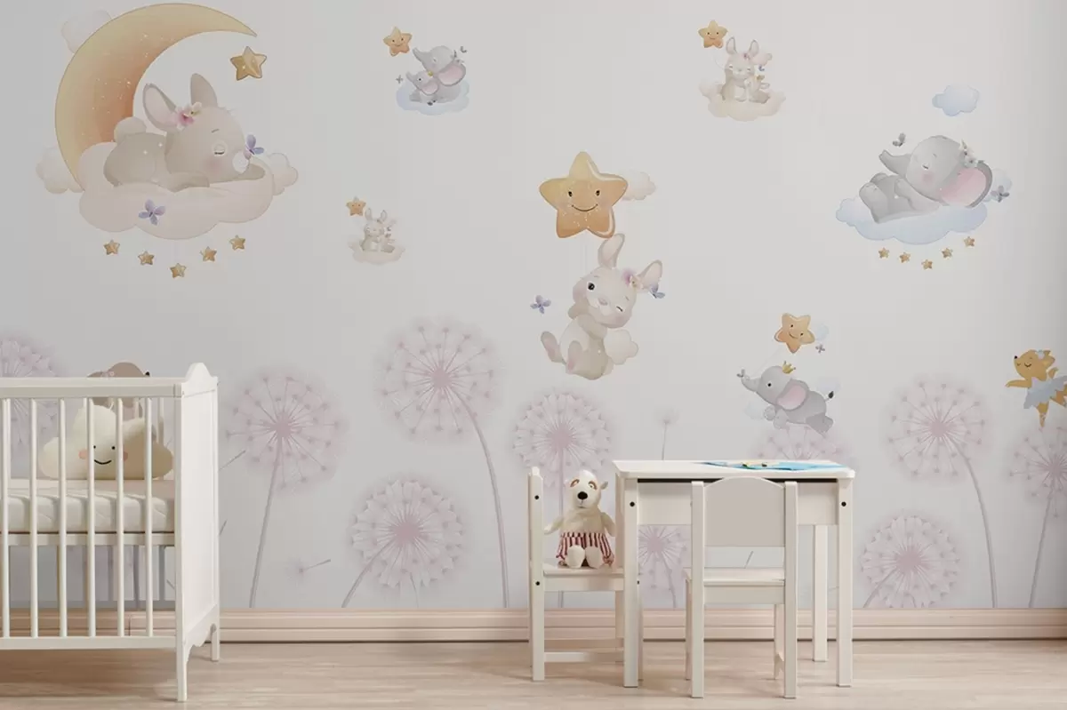 Fototapeten Nettes Kaninchen und Sterne zwischen Löwenzahn auf weißem Hintergrund N° w04195