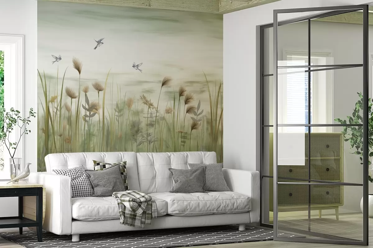 Fototapeten Graslandschaft mit Schwalben gegen weichen Himmel N° w04258v1