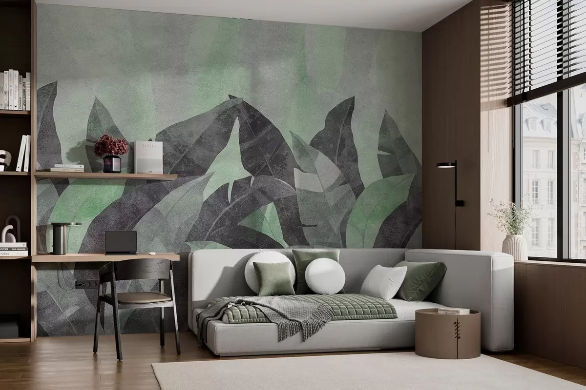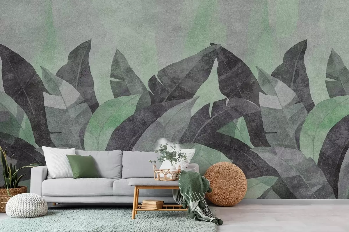 Fototapeten strukturierte Bananenblätter in Grün- und Grautönen N° w04285v1
